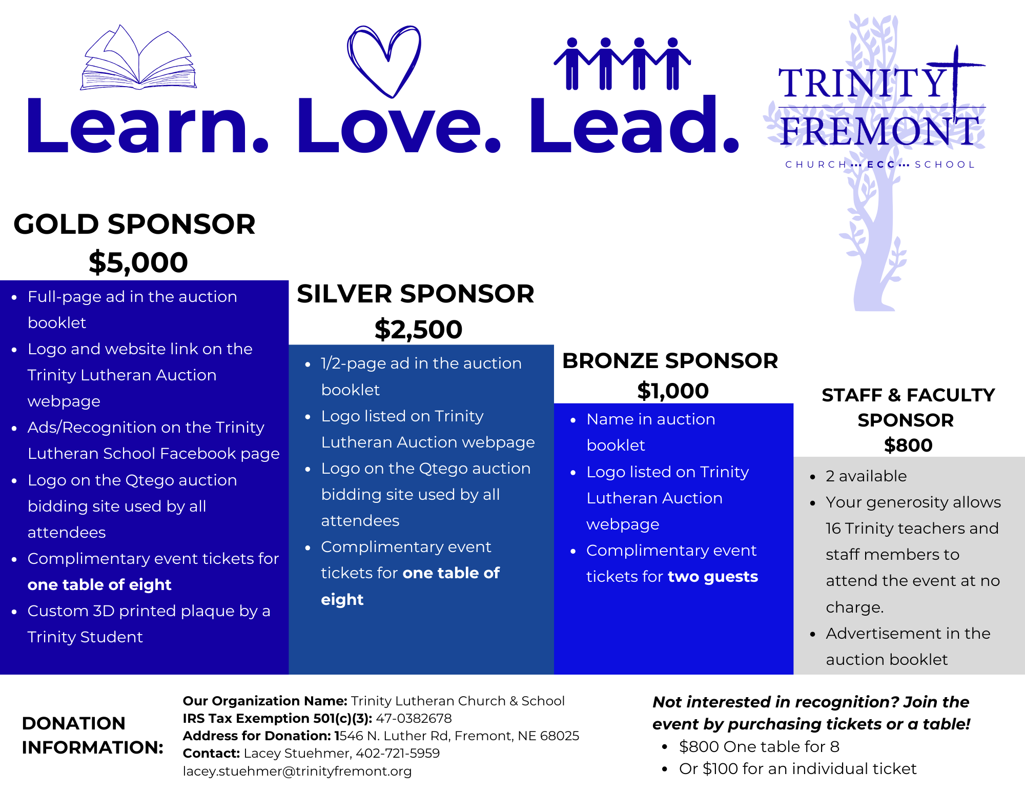 Join us for an unforgettable night at Trinity Lutheran School's Annual Auction on March 28, 2026! This year's theme, Learn. Love. Lead. captures the heart of what Trinity Lutheran School is building in children PRE-K through 8th. Enjoy a lively evening of bidding, fellowship, and community spirit, all in support of our school and its mission. We’d love to have you join us in person at the event, via online bidding during our auction, or by donations of auction items or sponsorships. There is a way for all Trinity supporters to get involved!